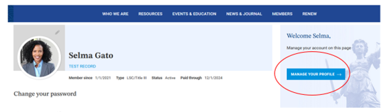 3. After the page refreshes, you will land on your main profile page where you can edit your password, update your profile, or even pay an invoice. There are hyperlinked prompts to manage components of your profile. Click on “Manage Your Profile” to add/update your photo, email, or website address or other contact information.